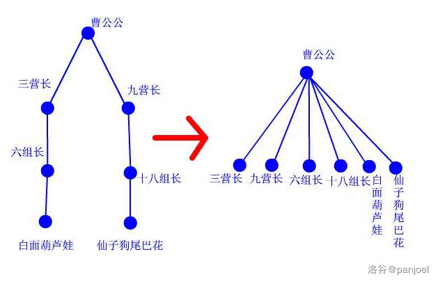 但是还有问题啊,大侠们只知道自己直接的朋友是谁,很多人压根就不认识队长。要判断自己的队长是谁,只能漫无目的的通过朋友的朋友关系问下去:“你是不是队长?你是不是队长?”这样,想打一架得先问个几十年,饿都饿死了,受不了。这样一来,队长面子上也挂不住了,不仅效率太低,还有可能陷入无限循环中。于是队长下令,重新组队。队内所有人实行分等级制度,形成树状结构,我队长就是根节点,下面分别是二级队员、三级队员。每个人只要记住自己的上级是谁就行了。遇到判断敌友的时候,只要一层层向上问,直到最高层,就可以在短时间内确定队长是谁了。由于我们关心的只是两个人之间是否是一个帮派的,至于他们是如何通过朋友关系相关联的,以及每个圈子内部的结构是怎样的,甚至队长是谁,都不重要了。所以我们可以放任队长随意重新组队,只要不搞错敌友关系就好了。于是,门派产生了。
